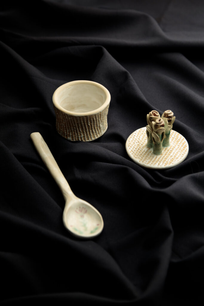 Käsitsi valmistatud keraamiline komplekt (25 €) – väike kauss kaanega ja lusikas. See ese on loodud Lanoori tugikeskuse klientide poolt. Kauss sobib hästi näiteks suhkru, mee, soola või väikeste esemete hoidmiseks. See keraamiline komplekt on rohkem kui tarbeese – see on lugu hoolimisest, ajast ja käsitööst.